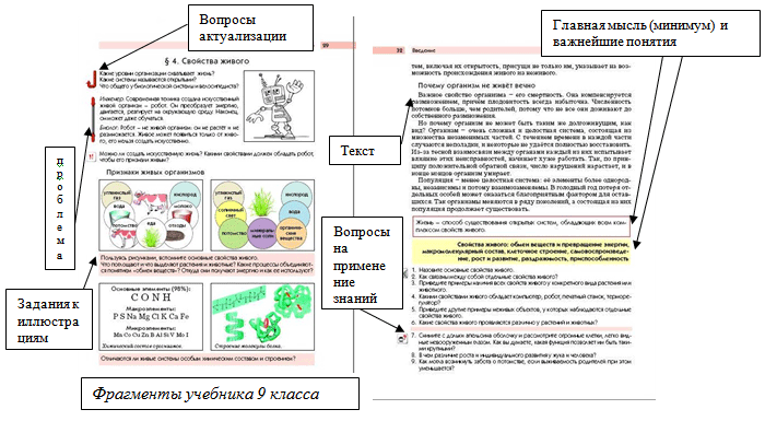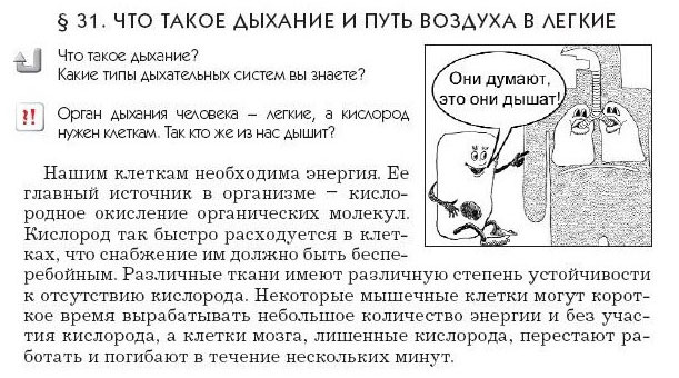 2. Мы уделили особое внимание форме подачи учебного материала. Учебник нацелен на проблемный стиль и повышенную мотивацию в обучении. Авторы старались использовать знакомый школьнику занимательный, доверительный бытовой язык изложения, считая, что содержание для подростка должно быть не нудным, а интересным, понятным. По этой же причине в учебнике используются афористичные («говорящие») названия параграфов и рубрик, что облегчает организацию работы учителя с учениками по изучению текста, упрощает поиск необходимой информации на этапах актуализации знаний и изучения новой темы. Но это не заигрывание с учащимся. Обращение к близким школьнику понятиям часто дает значительные возможности подробно рассказать об очень сложных процессах, идущих в организме, что бывает непросто при использовании строгого академического языка.